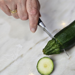 Wash and dry a medium-sized zucchini. Cut off both ends and slice thinly with the peeler as far down as the seeds. This should be done on all four sides. Discard or add the core of seeds to another stir-fry dish. Zucchini ribbons/seeds can be stored in an airtight container in the fridge for up to three days.