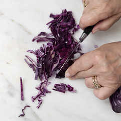 After removing the heavy outer leaves, rinse the cabbage. Cut it in half or quarters and remove the tough core. After cutting into shreds, wash the cabbage carefully and dry it. I usually soak my chopped salad in salt water to dislodge any soil or bugs. After straining and rinsing, dry the cabbage with a paper towel or salad spinner.