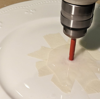 Next, apply masking tape to the other side of the plate, and you're ready to drill. When you start the hole, hold the drill at a slight angle initially. Gradually move the drill up until it is at a right angle to the plate. Keep the drilling area cool with cold water. With the drill set to medium speed, it should take just a few minutes to create the hole. Remember to keep the drill bit cool with water and do not run the drill at high speeds for more than 30 seconds at a time, or the plate may crack.