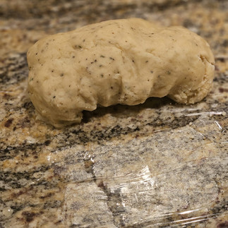 Press a sheet of cling film (saran wrap) flat on the counter. Make sure the cling film sticks to the countertop (easy with stone surfaces or just wet the back of film lightly so it adheres to the surface). The next steps are shown in the video above. Pick up one of the thirds of dough and press gently into a ball to remove air pockets. and then place in top of the cling film. Roll dough into a log about 1.5 inches (just under 40 mm) in diameter. Then roll the dough up in the cling film. When you have three rolls these should be put in the freezer for at least 1.5 hours. If the dough log is soft, you can slide each wrapped dough log into an empty kitchen paper towel roll to keep the roll in shape.
