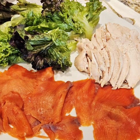 3 Cut up smoked salmon, prepare chicken and/or tofu and cut into strips.