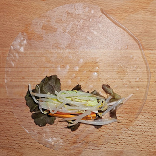 6. Take a rice wrapper and immerse in the hot water in dish then place on chopping board. Starting with lettuce - pile ingredients onto wrapper and then roll tightly - tucking in one or both ends half way through rolling up.
